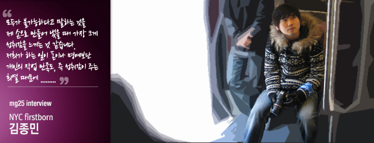 안녕하세요. 저는 현재 뉴욕에 위치한 firstborn에서 인터렉티브 디벨로퍼로 일하고 있는 김종민입니다. 디벨로퍼이지만 디자인하는 것 도 좋아해서 인터렉티브 디자이너로도 활동하고 있습니다. 화려한 디자인보단 최소한의 요소로 디자인하는 미니멀리즘을 추구하며, 특히 타이포그래피와 황금비율에 관심이 많습니다. 그리고 추상적인 미디어 아트 보다는, 좀 더 컨셉이 명확하게 드러날 수 있는 프로젝트를 추구하는 편입니다.