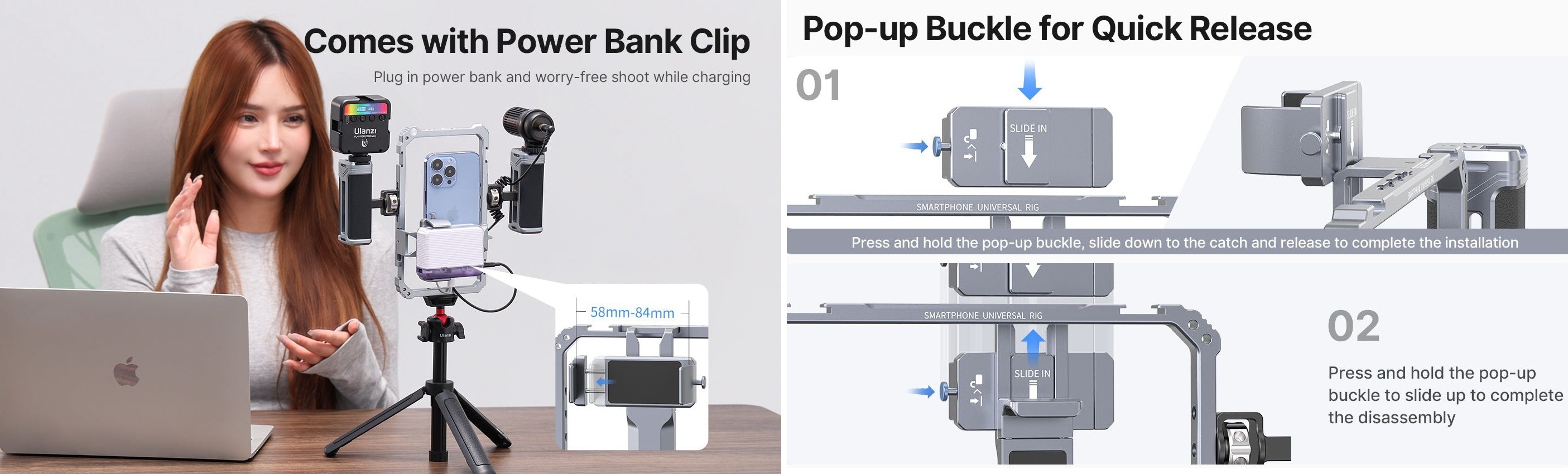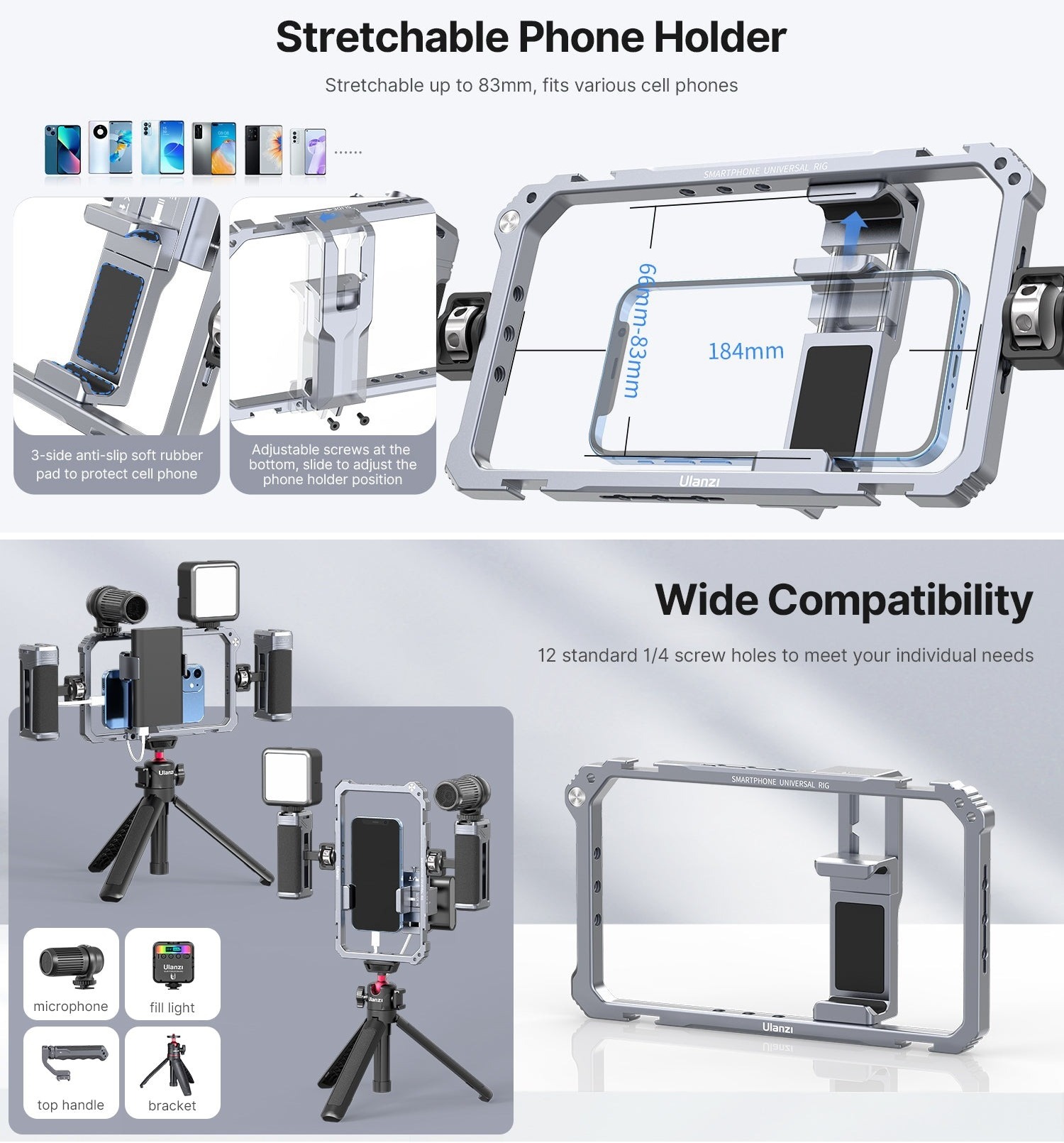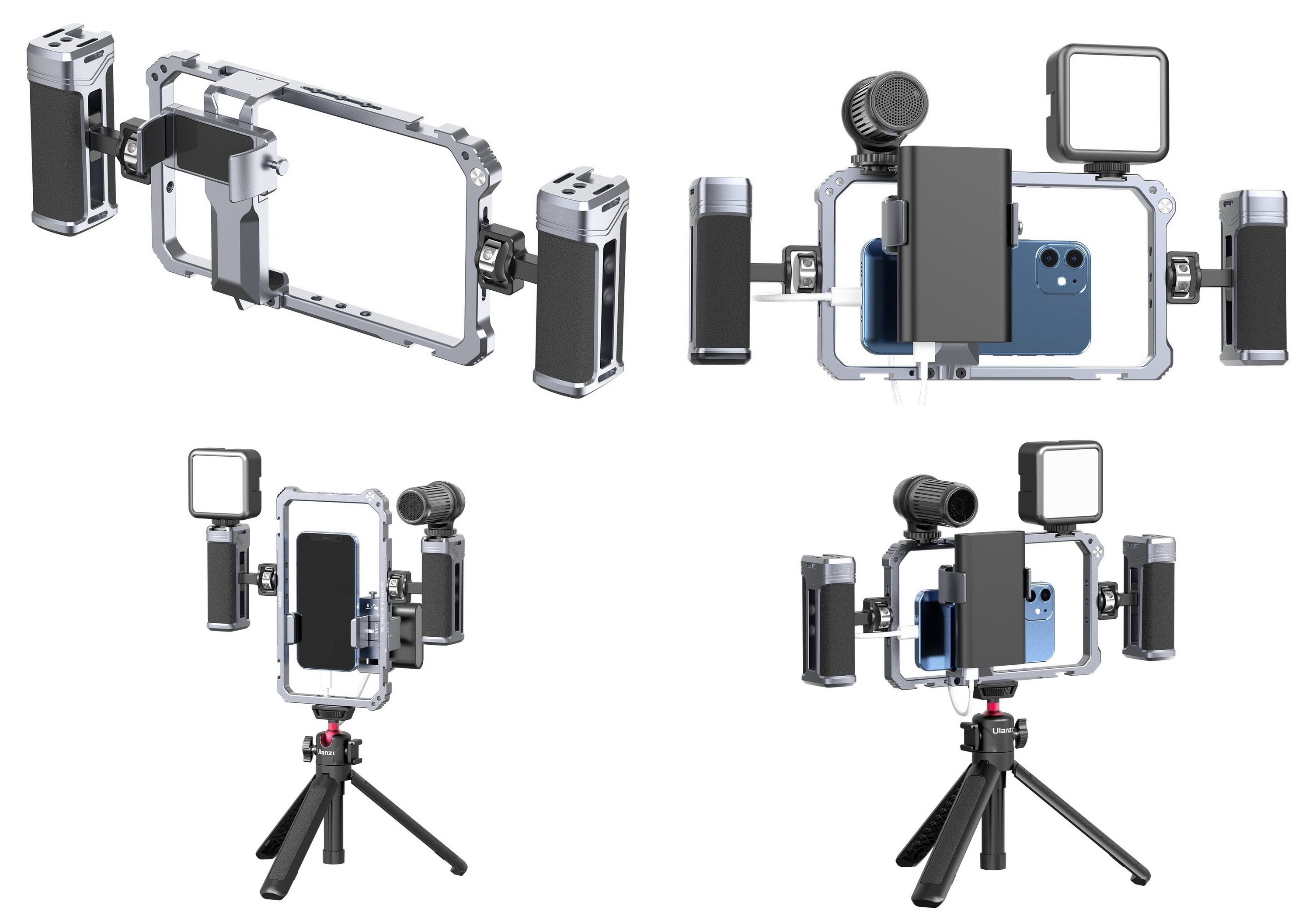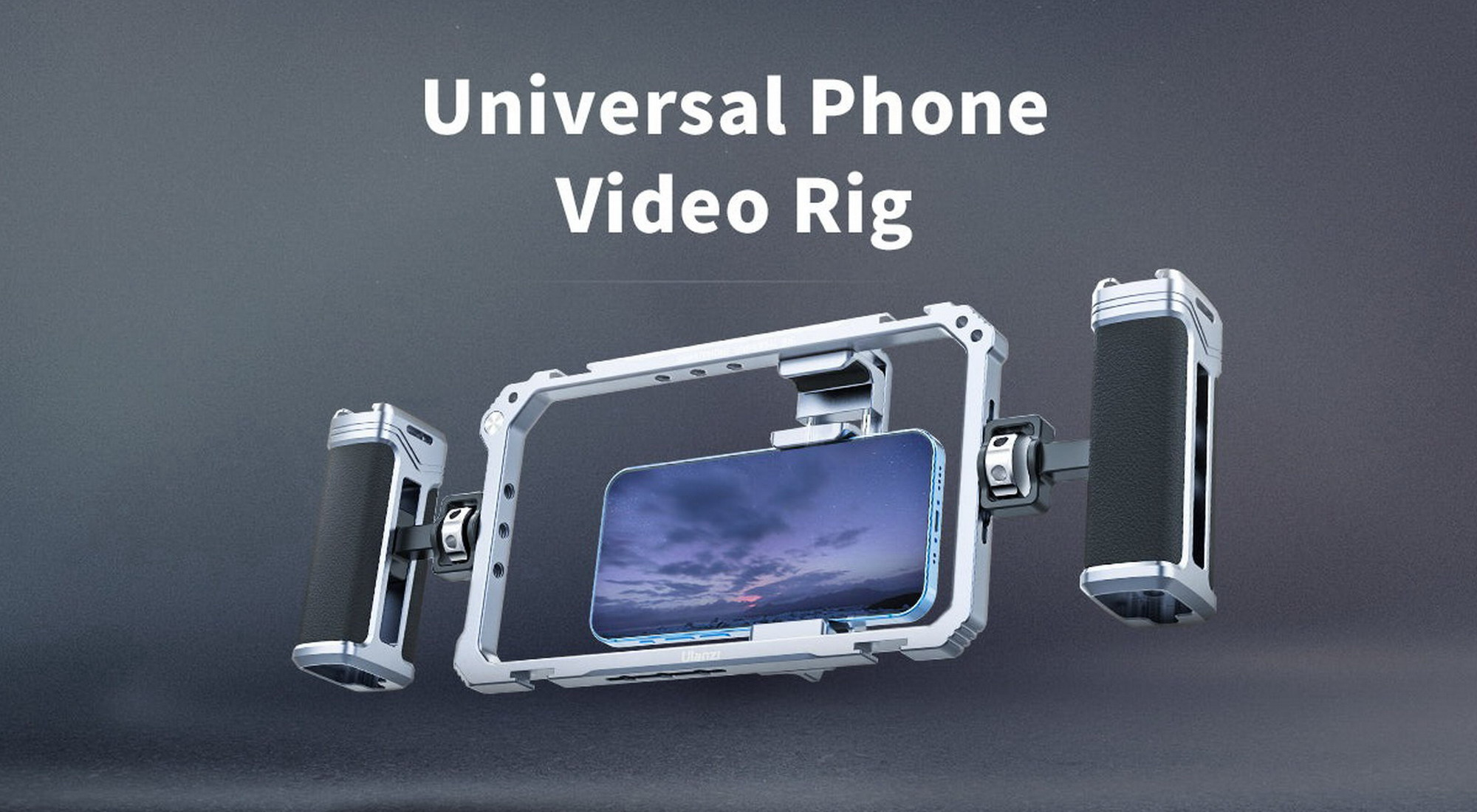 Ulanzi社의 Universal Phone Video Rig는 가벼운 Aluminum Alloy와 Silicone으로 제작되었으며, 그립감이 뛰어난 Double Handle을 채택하여 안정적이면서도 흔들림 없는 촬영이 가능하다. Cage에는 12개의 1/4 Screw Hole과 4개의 Cold Shoe Mount가 탑재되어 Microphone, LED Light, Top Handle, 소형 Tripod와 같은 다양한 주변기기들을 장착할 수 있다. 기본 구성품을 장착한 무게는 720g이고, 크기는 236mm x 143mm x 55mm이다.