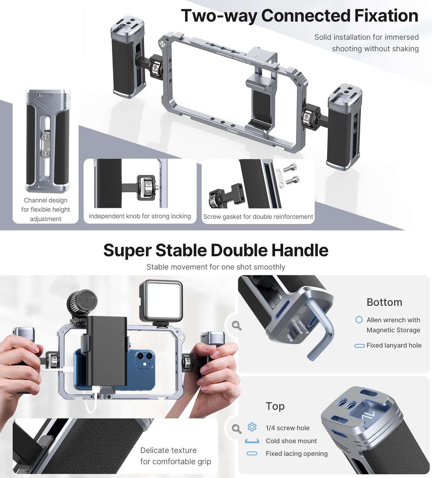 Ulanzi社의 Universal Phone Video Rig는 안정적인 Dual Handle과 유연한 Smartphone 거치대를 기반으로 다양한 주변기기를 장착할 수 있는 확장성을 갖췄다.