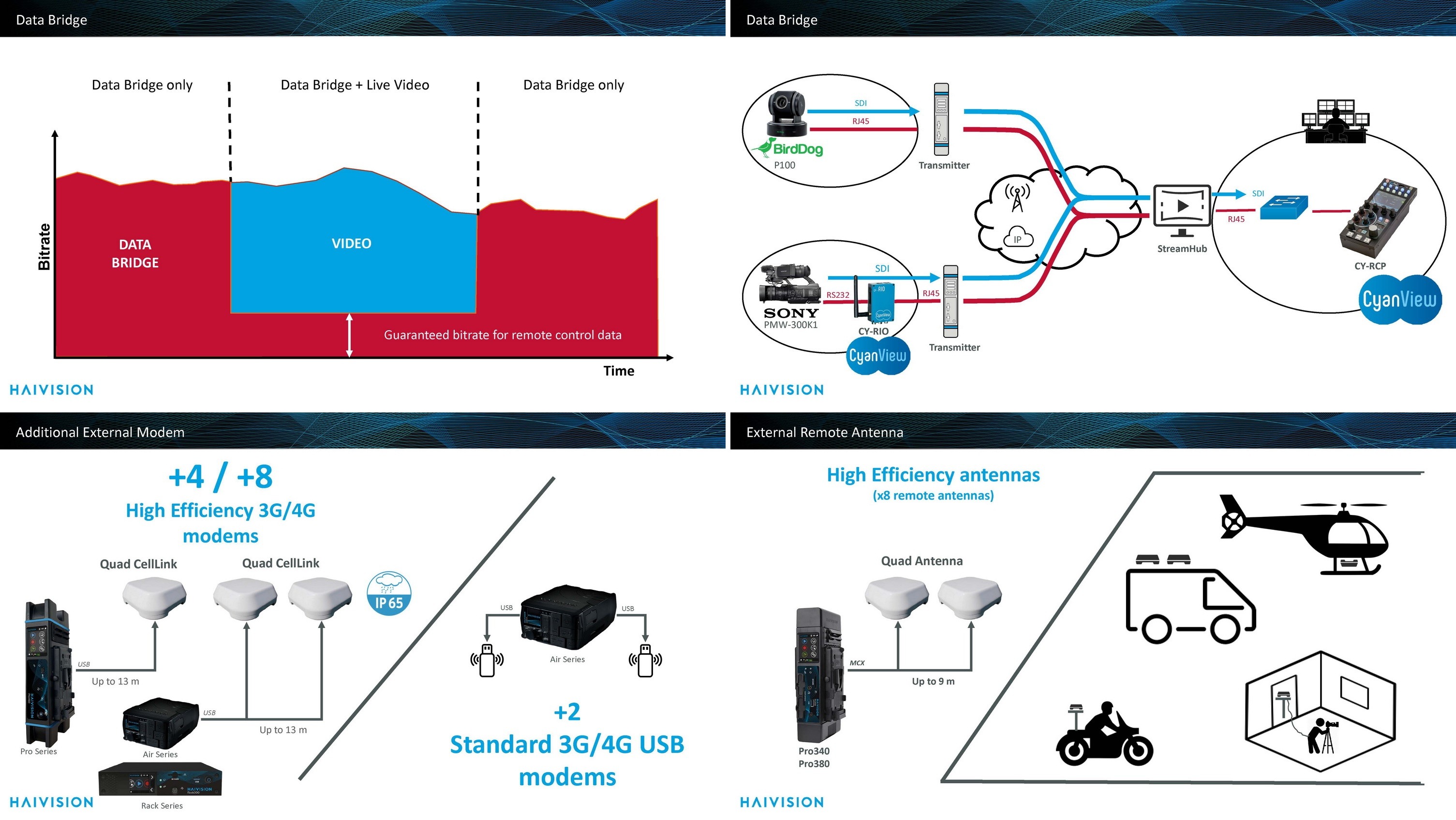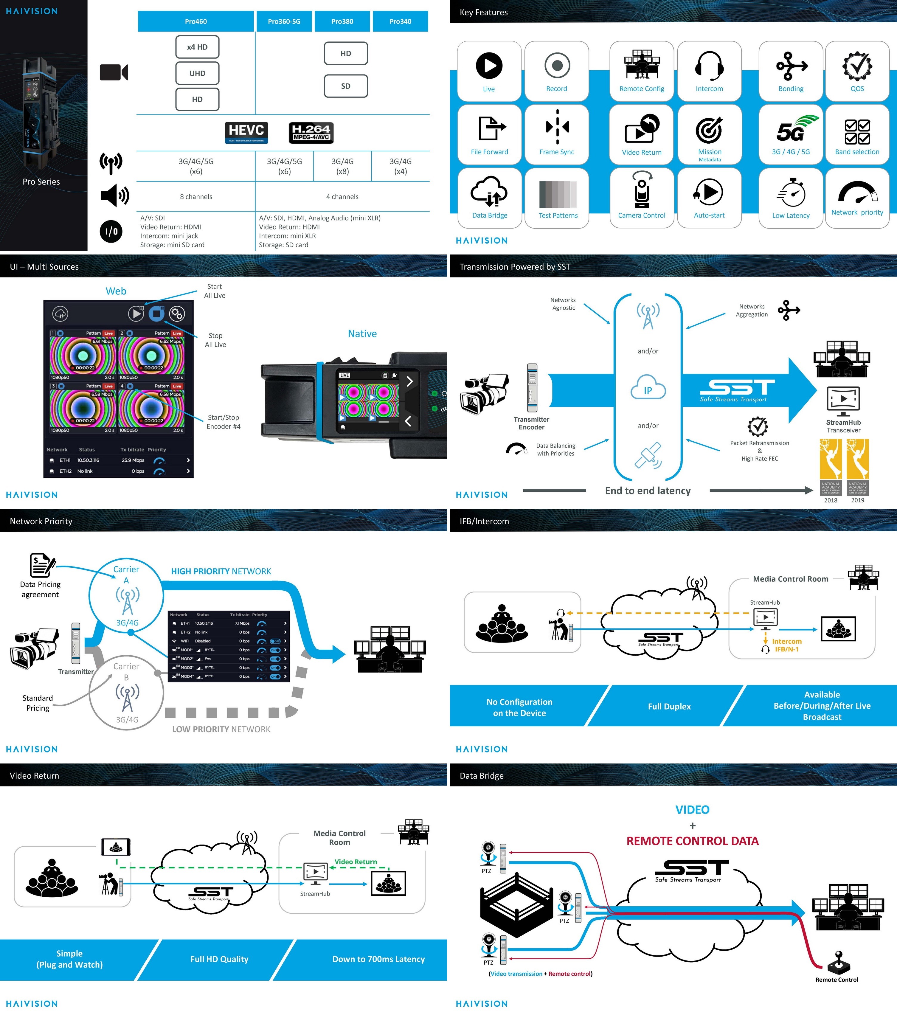 Haivision社의 Pro Series는 실시간 뉴스 및 스포츠 중계, 이벤트 영상 제작을 위해 설계된 IP Video Solution으로, 고품질 Video와 Audio를 Low Latency로 전달하는 것을 목적으로 한다. Video Return, Intercom, Remote Control 등을 위한 IP Data Bridge와 같은 고급 기능을 다양하게 포함하고 있다.