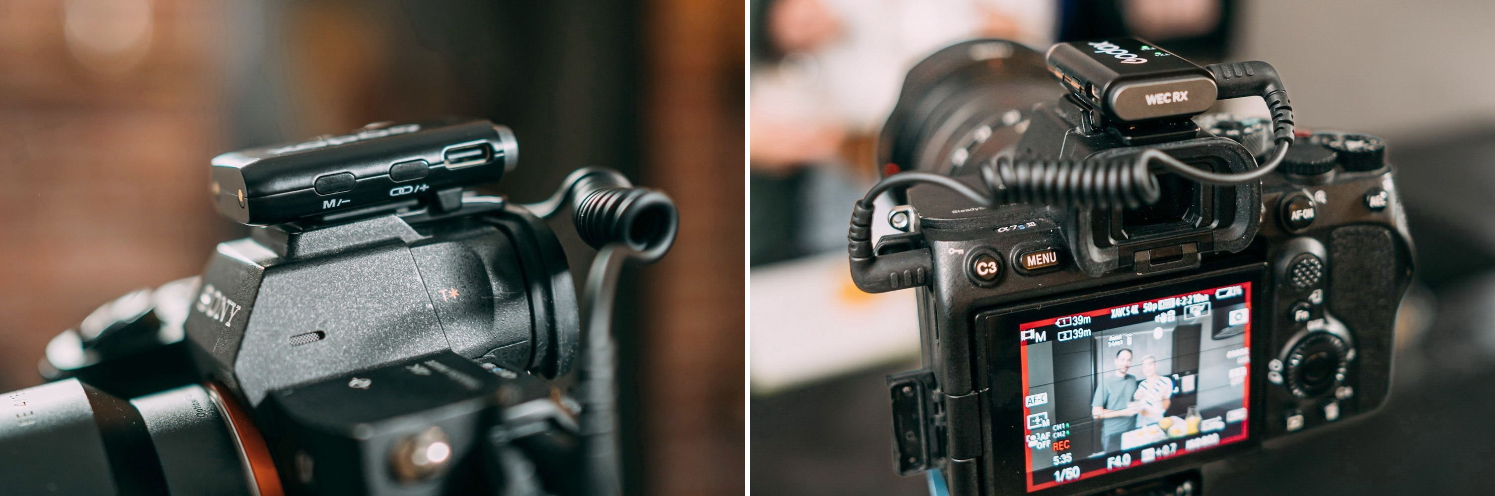 WEC의 Transmitter와 Receiver의 무게는 각각 12g과 16g에 불과하며, Charging Case도 84g이다. Receiver에는 카메라 또는 Smartphone 등에 연결할 수 있는 3.5mm Audio Output Port가 자리한다. Transmitter는 작고 가벼워 무리 없이 Back Clip으로 화자의 옷에 부착할 수 있으며, Receiver는 Back Clip으로 카메라의 Cold Shoe Mount에 장착해 제품 구성에 포함된 3.5mm TRS-TRRS Audio Cable이나 3.5mm TRS-TRS Audio Cable을 사용하여 카메라와 연결하면 된다.