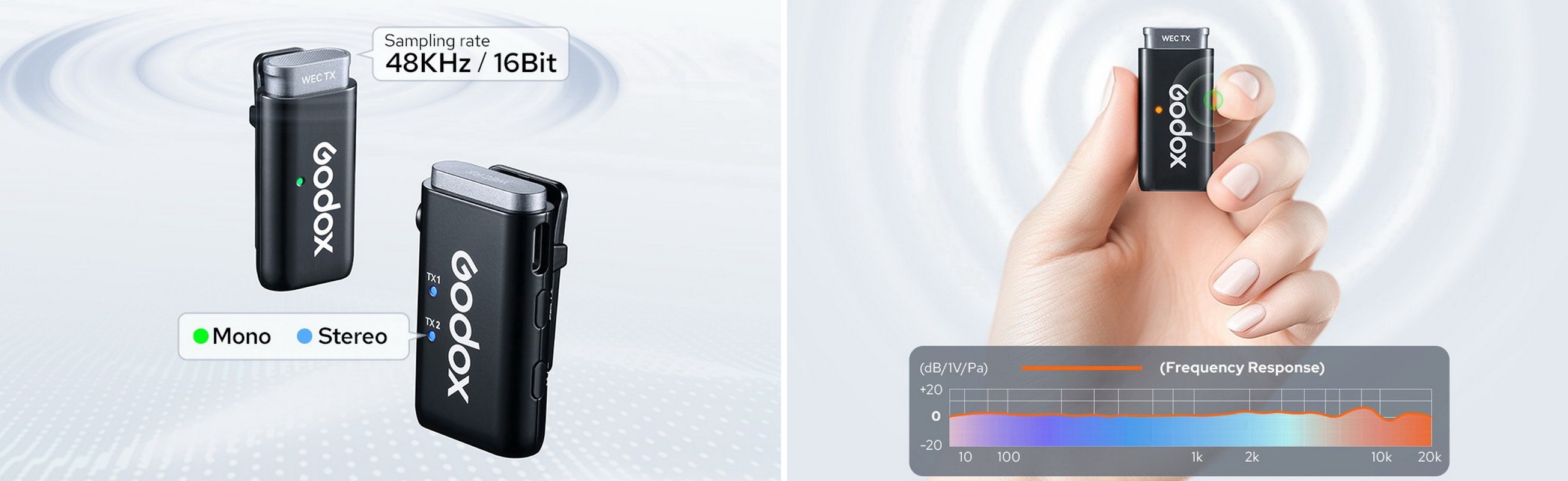 Godox社의 2.4GHz Wireless Microphone System인 WEC는 간단한 조작성과 초소형 및 초경량, 고음질, 넉넉한 작동 시간을 강점으로 내세우며, DSLR 및 Mirrorless Camera나 Smartphone으로 촬영하는 영상 컨텐츠 제작자들을 위한 다양한 편의성을 제공한다.