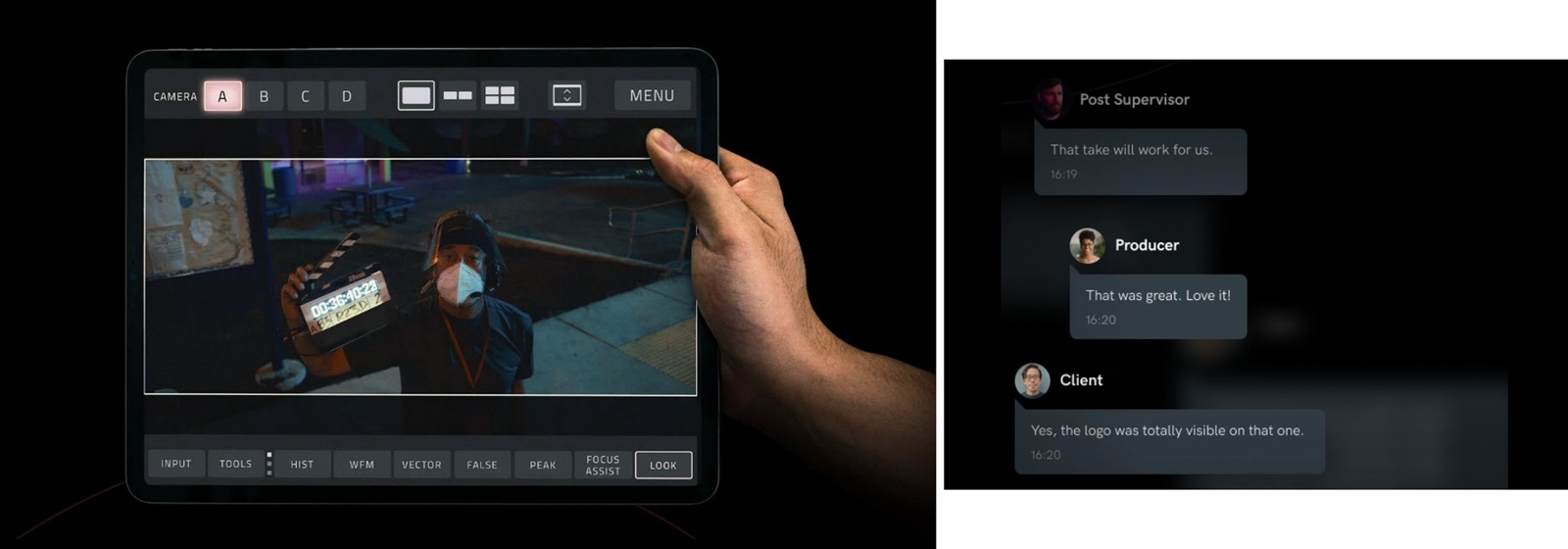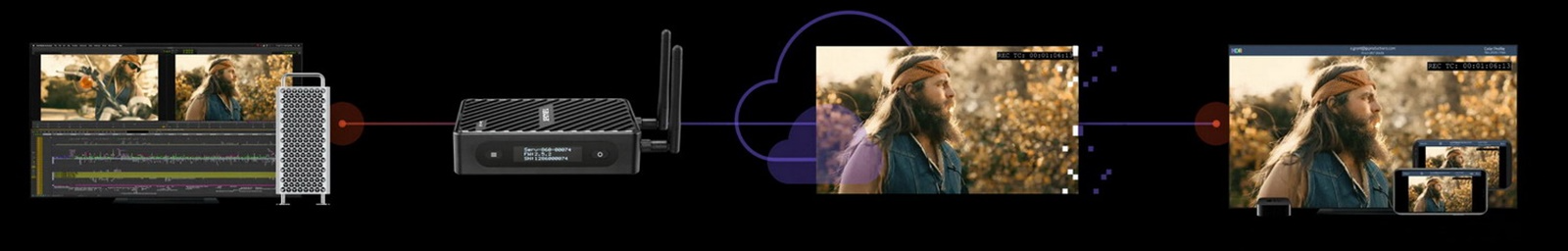 또한, Teradek Core와 Adobe frame.io와 같은 Cloud Platform에 실시간 미리보기 기능도 지원한다. 이 기능은 현장에서 떨어진 후반작업 Studio에서 4K HDR Video의 실시간 미리보기를 가능하게 한다. 이론적으로는 Cloud Platform에 접속만 하면 되므로, Device의 최대 연결 대수에 제한이 없다. Teradek Core는 대화 기능도 포함되어 있어서 작업과 동시에 업무 연락을 진행할 수 있다. 음성 메시지 기능도 제공되므로, 협업에 도움이 된다.