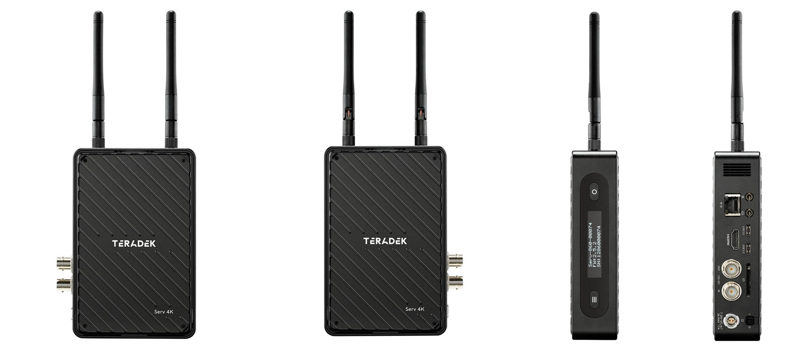 Serv 4K의 크기는 150mm ×107mm × 36mm, 중량은 476g이며, 하단에 위치한 1/4″-20 Mounting Point를 활용해 가로 세로 원하는 방향으로 설치할 수 있다. 제품 상단에는 2.4/5.8GHz Wi-Fi 안테나 2개를 탑재했고, 측면에는 간결한 설정 버튼과 기본적인 정보를 표시하는 작은 OLED Display가 있다. 이 밖에 On/Off Switch, 2-pin Lemo DC Port(7V-28V 최대 3A), SD Card Slot, 12G-SDI 입출력, HDMI 2.0 입출력, USB Type C Port 2개, 3.5mm Mic 입력, 3.5mm Headphone 출력, LAN(RJ45) Port가 배치되었다.