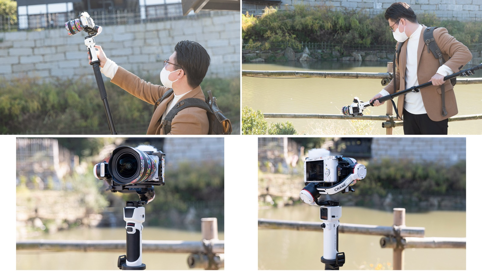 CRANE M3의 무게는 본체 기준으로 약 730g, 높이는 어른 손바닥 정도이며, Smartphone부터 소형 Cinema Camera까지 장착이 가능하다. 물론, 대형 Zoom Lens 또는 Cinema Lens는 장착이 불가능하지만, 대중적으로 사용하는 소형 Lens는 대부분 장착이 가능해, 다양한 영상미를 연출할 수 있다.