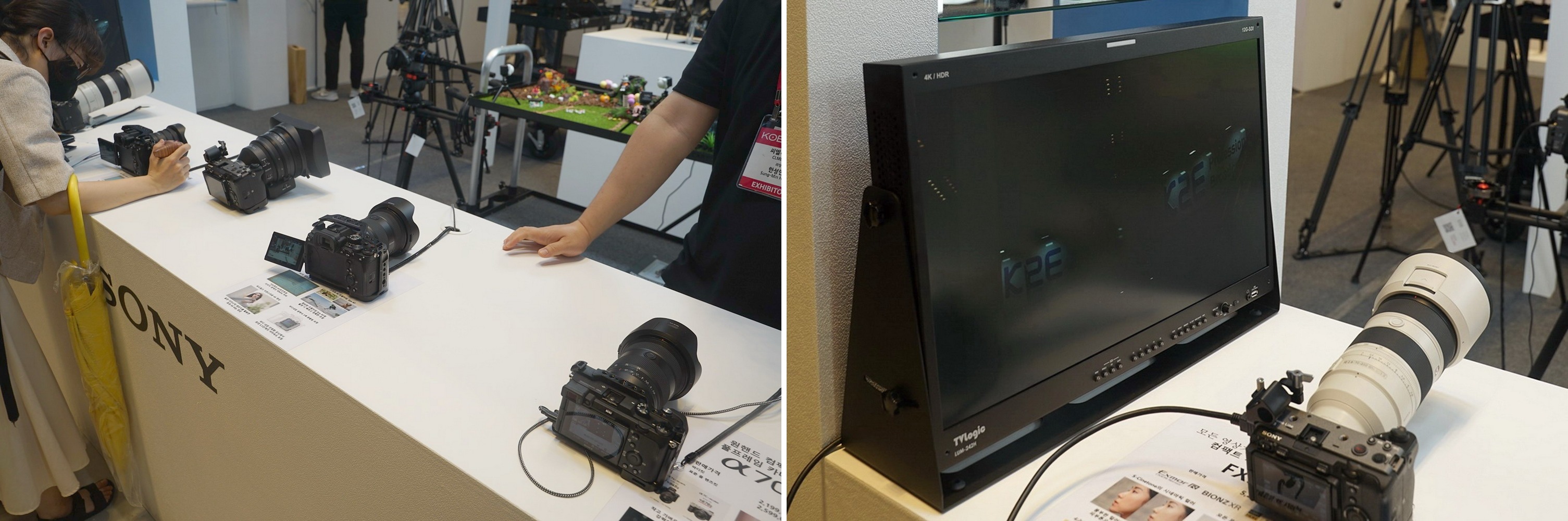 SmallRig社의 Rig가 장착된 Sony α7C, α7M4, FX3 등의 카메라들과 TVLogic社의 24” 4K Monitor LUM-242H가 함께 전시된 모습