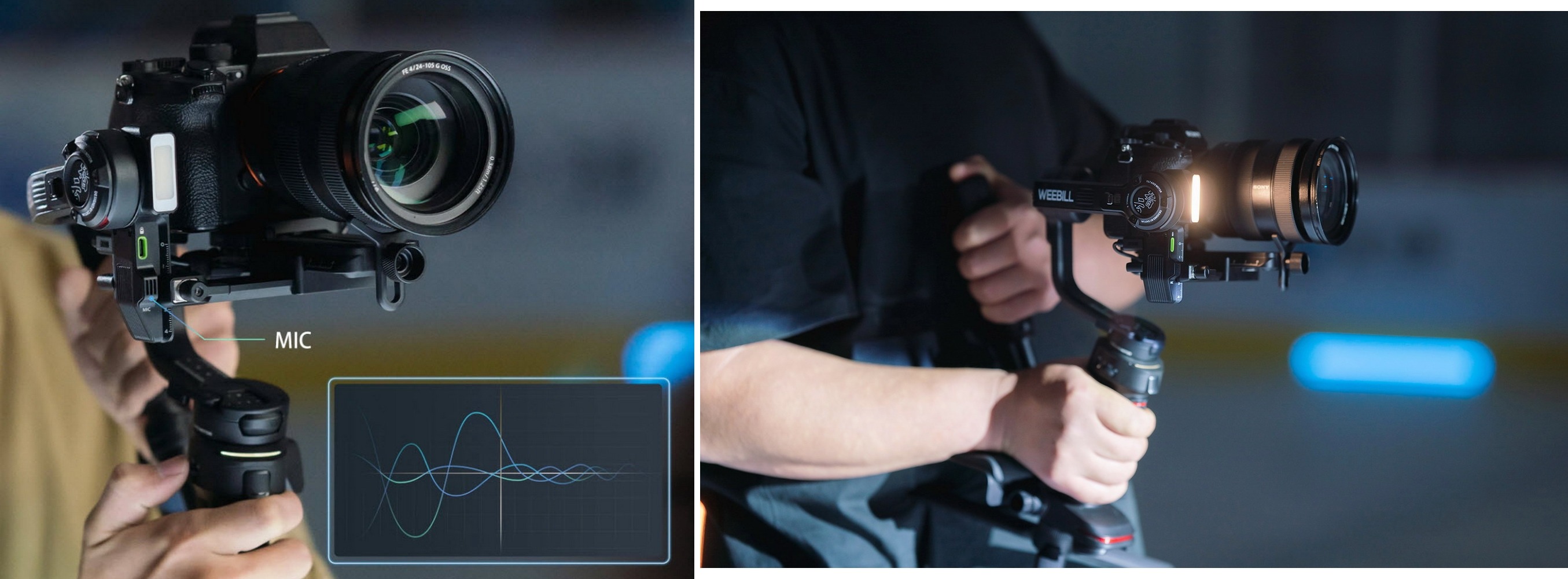WEEBILL 3는 Noise Canceling 기능을 가진 Hi-Fi Microphone과 1000Lux의 Fill Light가 내장되어 장비 추가에 대한 부담을 낮췄다. Hi-Fi Microphone은 전방 지향성이며, Fill Light는 촬영 환경에 따라 2600K-5400K의 색온도 조절이 가능하다. Cooling System도 장착되어 발열을 방지하고, 빛의 밝기를 일관되게 유지한다.